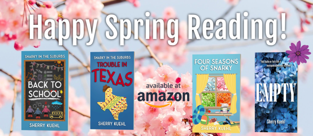 If you want a real break I suggest relaxing with one of my books.😍There’s Empty a “laugh till you cry” menopausal revenge adventure. (Yes, you read that right, menopausal revenge. It’s a thing.) Back to School is a hysterical read for any mom who’s experienced elementary school parent drama. Trouble in Texas is a tall tale of what happens when a daughter lets her septuagenarian mom enlist her in a wild scheme that could end up with both of them in jail. And Four Seasons of Snarky is full of short stories (perfect for the person who doesn’t have much time to read) that feature tales of suburban revenge. 😉
