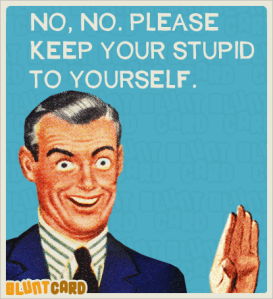 Now, I know if I had allowed myself to have conversation with this filter-less goobers their standard response would be “I was joking.” No, you weren’t joking. Instead you choose not to practice verbal discipline. I think the whole Homeland Security tag line “See something. Say something” has been co-opted by the filter free crowd.