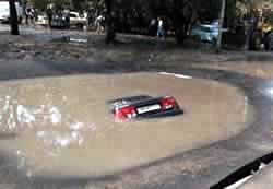 Just as we made it to safety we saw a car being swallowed by the pothole. We stopped and the driver was okay but her petite car needed life support. The tires were trashed and my son reported that the car’s undercarriage was “not good.”