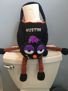 Because the thought of departing with these items is so painful I decided to justify still keeping them by making these beauties a part of my Halloween decoration scheme. Let me just say there are times in everyone’s life when they will have moments of genius. My moment came when I turned old, no make that vintage, Halloween treat bags into holiday themed toilet paper holders.
