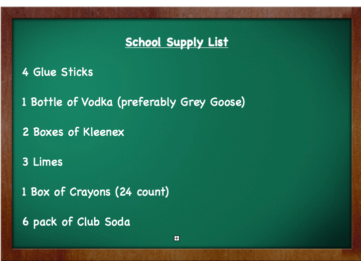 Well, someone took the supply lists out of the folder and replaced them with copies of lists that look legit but instead were filled with stuff like vodka for “hand sanitizing purposes,” Depends for when “your kid’s teacher can’t leave the classroom to pee. Remember that nugget on Teacher Appreciation week” and gift cards “because teachers need some incentive to come back the next day.”